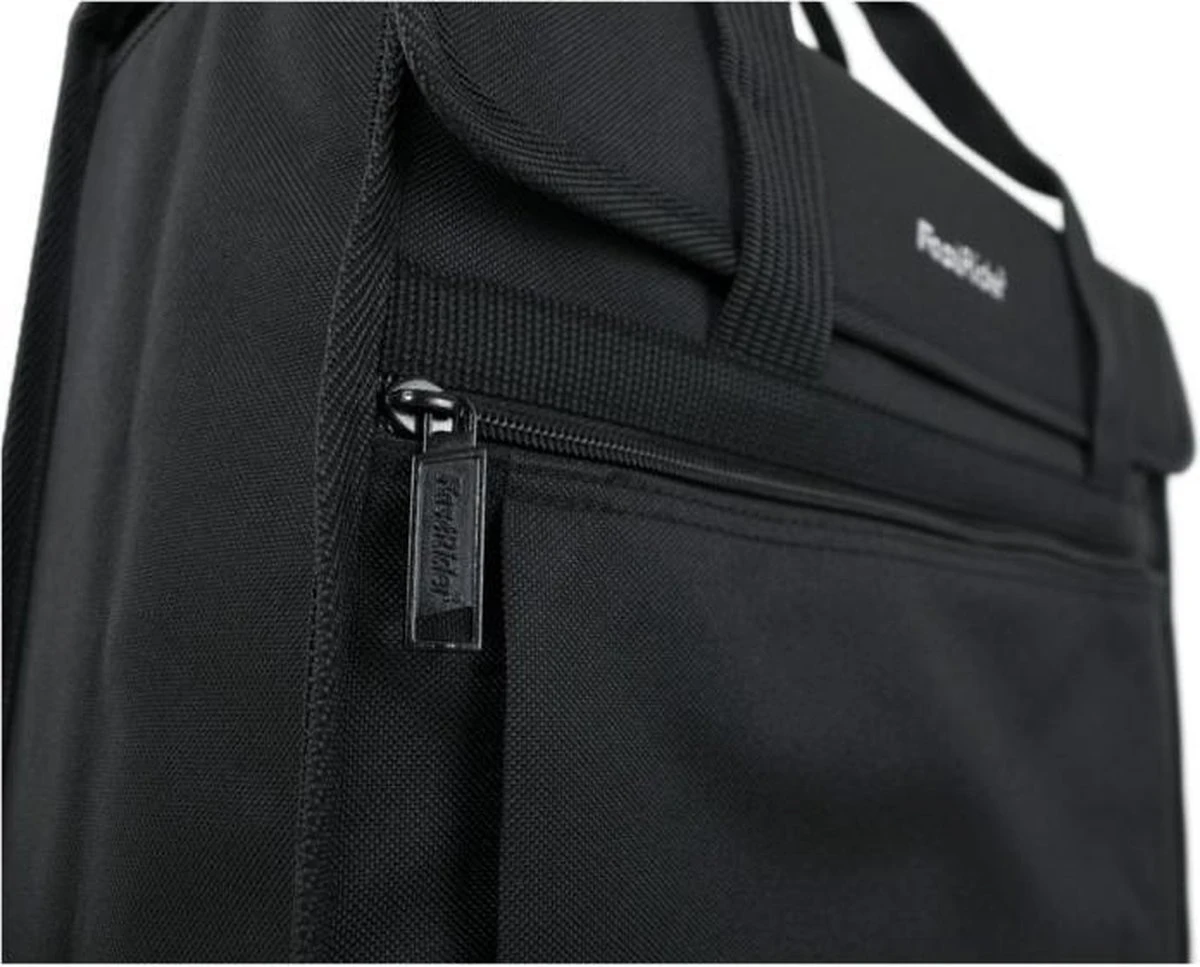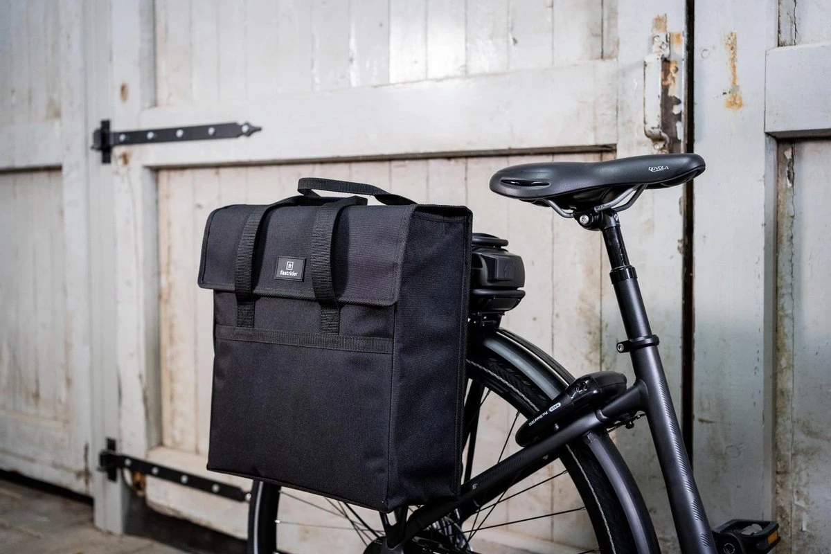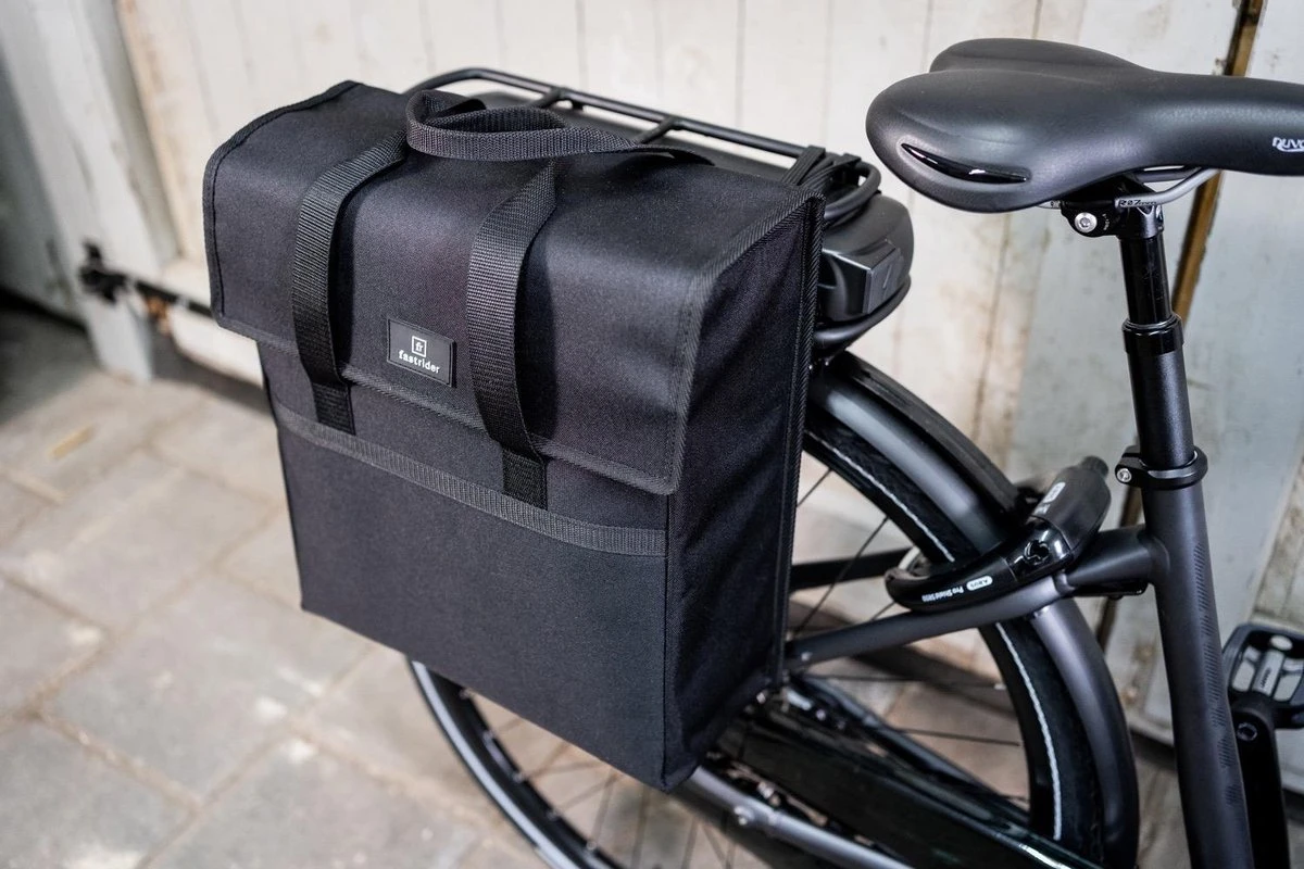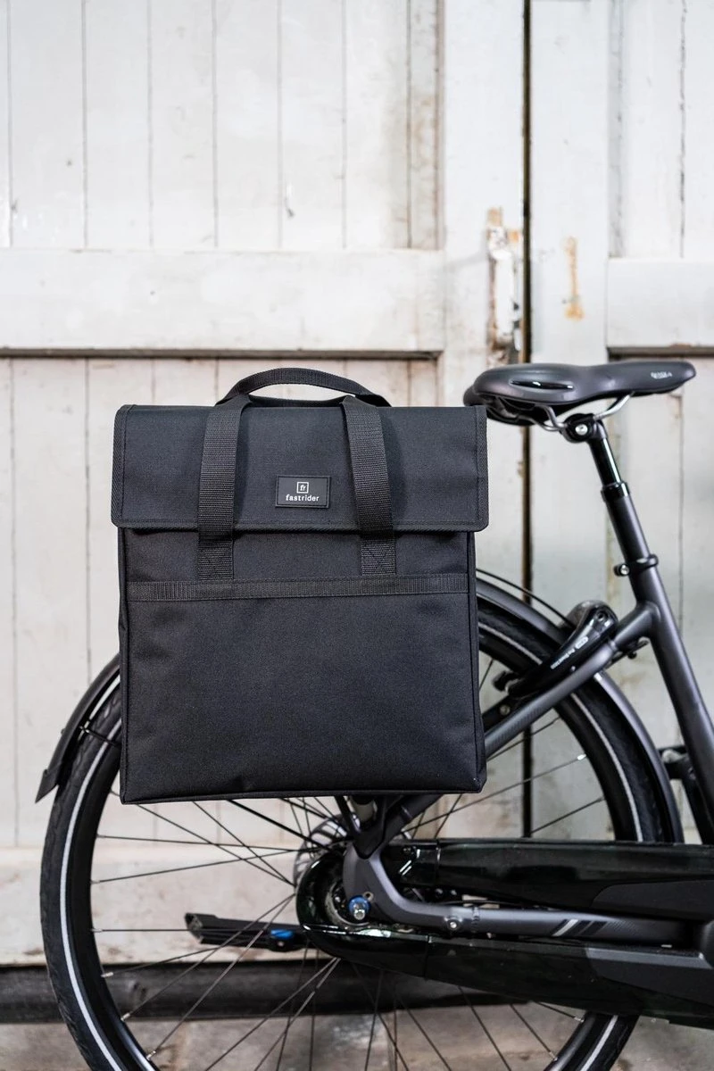 De FastRider Enkele Fietstas Zwart (17L) combineert een subtiel ingetogen ontwerp met eigentijdse toevoegingen voor intensief dagelijks gebruik. De tas is gemaakt van waterafstotend recycled Polyester, wat zorgt dat de spullen in de tas droog blijven bij een kleine regenbui. De ruime inhoud en verstevigde bodem en zijkanten zorgt ervoor dat er veel spullen inpassen. De tas is voorzien van handvatten zodat het als shopper te gebruiken is. Ook met een elektrische fiets kan je deze tas gemakkelijk gebruiken dankzij de Vario E-haken.