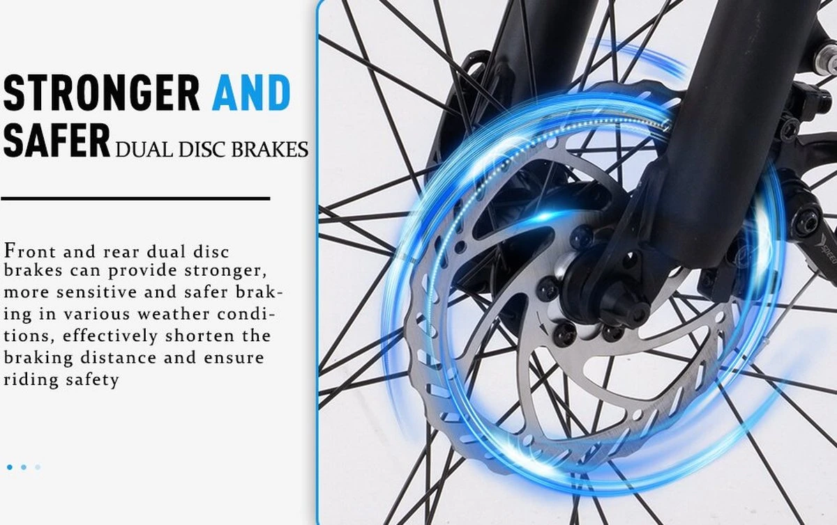 Reliable safety guarantee – The electric bicycle is equipped with a dual disc brake system, which can effectively reduce the braking distance. High-brightness headlights and rear mirrors provide you with excellent visibility and effectively ensure the safety of your night riding.