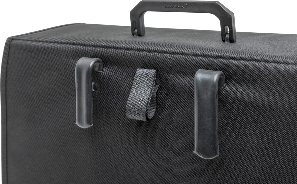 De fietstas wordt aan de bagagedrager bevestigd met New Looxs stalen haken die beschermd zijn met een rubber laag. Dat maakt deze tas geschikt voor vrijwel alle fietsen, ook elektrische. Je kunt de tas extra vastzetten met het klittenbandje tussen de haken.