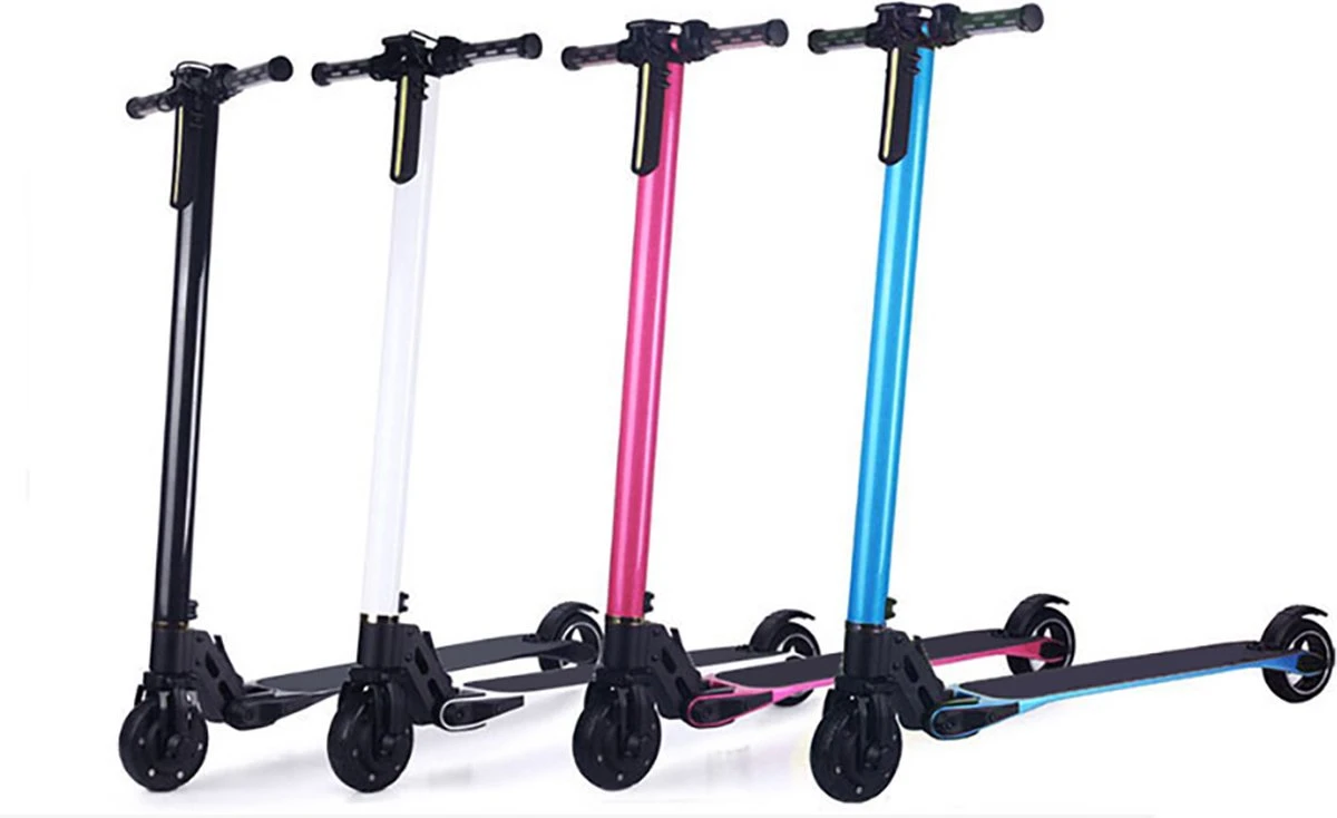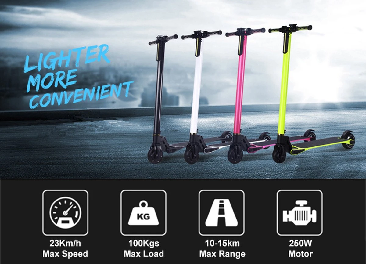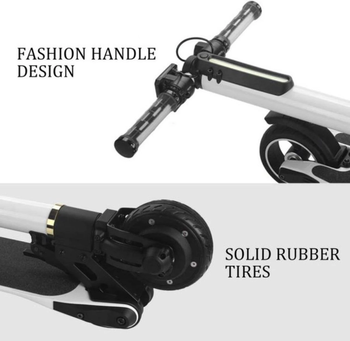 De elektrische step weegt slechts 9 kg, dit maakt de e-step draagbaar en in combinatie met het opvouwbare ontwerp is de step eenvoudig thuis, op kantoor of in de kofferbak van een auto op te bergen of met de hand te dragen indien nodig. Het is handig en compact, waar u ook heen reist. Verder is het stevige frame gemaakt van carbon van luchtvaart kwaliteit, wat een hoge structurele sterkte heeft. Het heeft ook een uitstekende thermische geleidbaarheid en corrosiebestendigheid voor extra duurzaamheid. De Elektrische step is makkelijk overal mee naar toe te nemen dankzij het 1-stap vouwsysteem en miniwielen aan de voorkant voor gemakkelijke verplaatsing (zie foto hierboven).