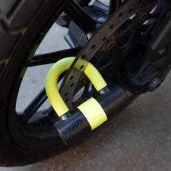 Nooit meer vergeten het slot eerst van het schijfrem te halen, voordat je wegrijdt, met de handige meegeleverde gele reminder kabel.