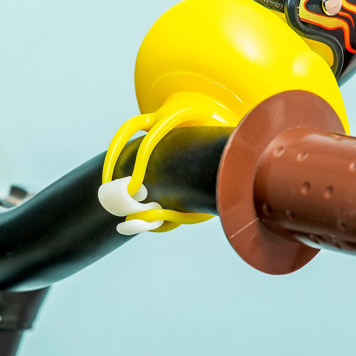 Fiets badeend van Winkee. Badeendje voor op het stuur van je fiets. Dit badeendje, met een coole motorhelm met vlammen, maakt elke fietsrit leuker. Hij zit trots op je fietsstuur, te genieten van de pracht en praal van de natuur of de stad. De rotorbladen op de helm draaien in het rond als je fietst. Eenvoudig te bevestigen en verwijderen. Afmeting verpakking: 14 x 8 x 7 centimeter.
