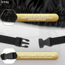 Door de goede pasvorm is de hoes makkelijk over 1 of 2 fietsen te plaatsen. Aan onderzijde voorzien van stevige elastische band die de hoes rondom de fiets(en) afsluit. Met de klik-gesp zorg je ervoor dat ook bij harde wind of bevestigd achterop de fietsendrager van je auto de hoes stevig op z’n polek blijft zitten.